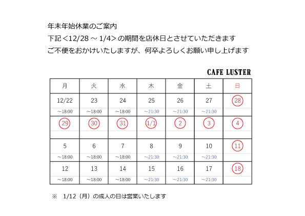 年末年始休業日のご案内